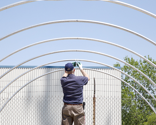 *Expert Tip: After the ridge pole is secured by the Purlin Brackets to all of the hoops, proper measurments for the lower purlins should be made to ensure that there will be enough space for different types of ventilation like fans, heaters, and hanging accessories. Keep this in mind before moving on to the next stage of your build.